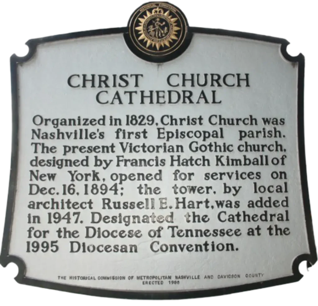 In June 1829, a congregation in Nashville elected the first Vestry of Christ Church and a little over a year later laid the cornerstone of the first Episcopal church structure in Tennessee. By 1837, Christ Church parish had grown to 72 members. Christ Church was fortunate to escape occupation by Federal troops during the Civil War and by 1867 had 145 communicants on its rolls. Construction began in 1889 on the current structure at 9th Avenue and Broadway, a building now listed in the National Register of Historic Places. It opened its doors for worship in December 1894, the first Eucharist celebrated there on Christmas Day of that year.