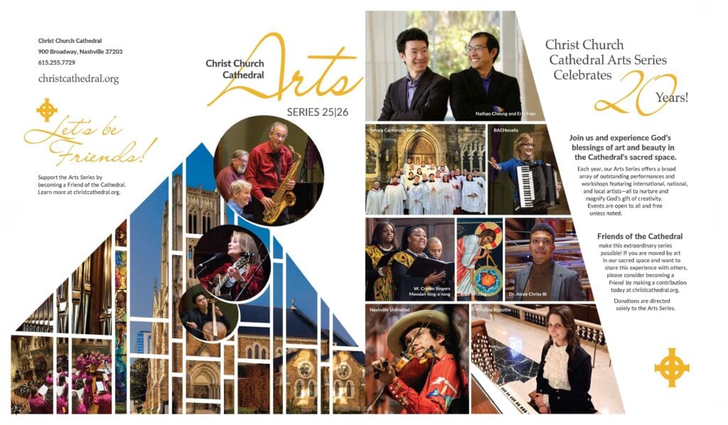 Since its inception in 2004, the Cathedral Arts Committee (formerly known as Cultural Arts Committee) has provided an annual season of arts events. Appointed the Cathedral of the newly minted Diocese of Middle Tennessee in 1997, the Cathedral Arts Committee follows the traditional role of medieval Cathedrals as a central gathering place for the larger community. Offering the arts to the community is a means of welcoming all people into our historic space. Over the past two decades, we have facilitated and celebrated over 175 programs in visual art, design, poetry, film, theater, and music, drawing in more than 20,000 attendees from Middle Tennessee and beyond. We are pleased to offer our twentieth full season for your enjoyment!