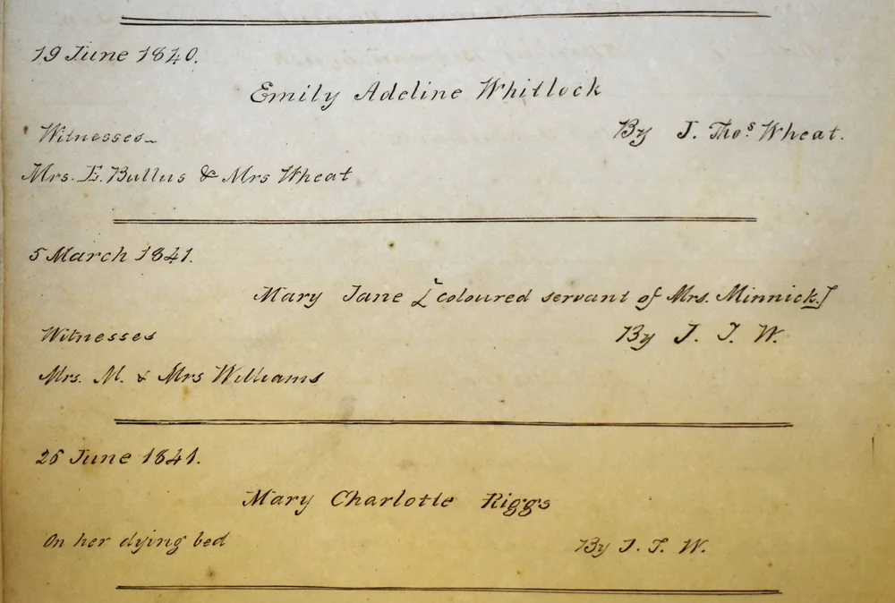 At Christ Church in Nashville, the Reverend J. Thomas Wheat baptized Mary Jane, who was described in the baptismal record as the “coloured servant of Mrs. Minnick,” on March 5, 1841. The sponsors/witnesses at the baptism were listed as “Mrs. M. and Mrs. Williams.” Mary Jane’s baptism is the earliest on record for an enslaved person or person of color at Christ Church.