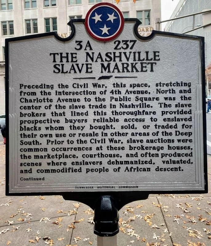 Historical marker in downtown Nashville marking the site of the Nashville slave market, erected in 2018. Source: The Historical Marker Database, https://www.hmdb.org/m.asp?m=145783