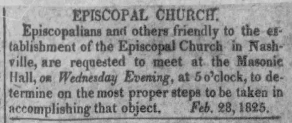 First newspaper announcement of an Episcopal gathering in Nashville. Source: Nashville Whig, Monday, February 28, 1825