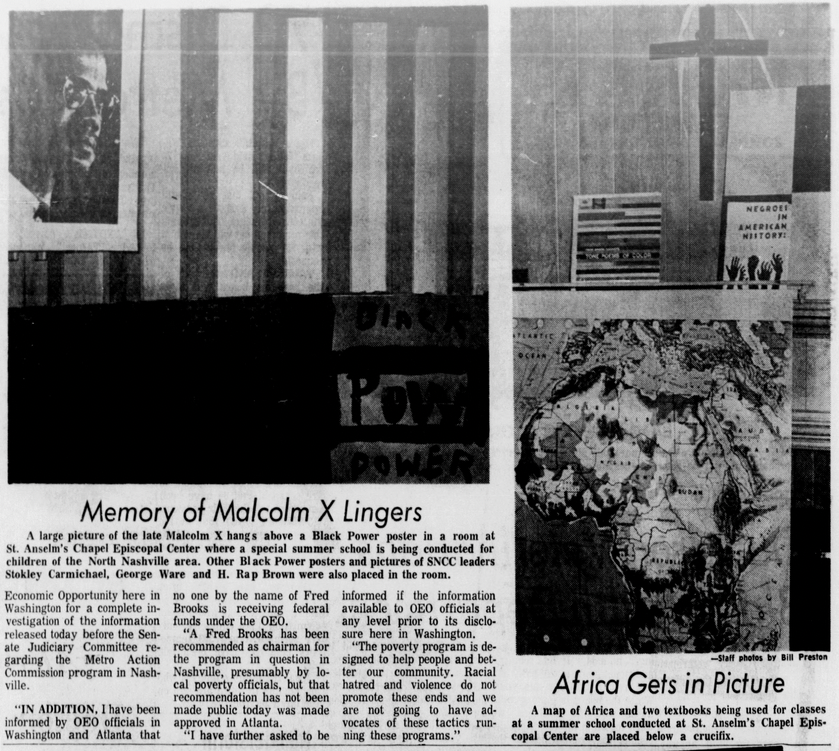 The liberation school continued, at least for a time, meeting on Saturdays in nearby Watkins Park. Rev. Woodruff resigned his position at St. Anselm’s in mid-September, having lost the support of the bishop. Reflecting on criticisms of his activism, Woodruff insisted that anyone “interested in a better society” must “be able to hear and understand ‘unpopular’ ideas.” For him, this included an unwavering commitment to Black Power, which, he readily acknowledged, was in fact being taught at St. Anselm’s. What Nashville’s white civic and religious leaders, including those associated with Christ Church, failed (or refused) to understand was that Black Power, as Woodruff patiently clarified, was “not racial hatred. We’re teaching racial love, a love of the black people.”