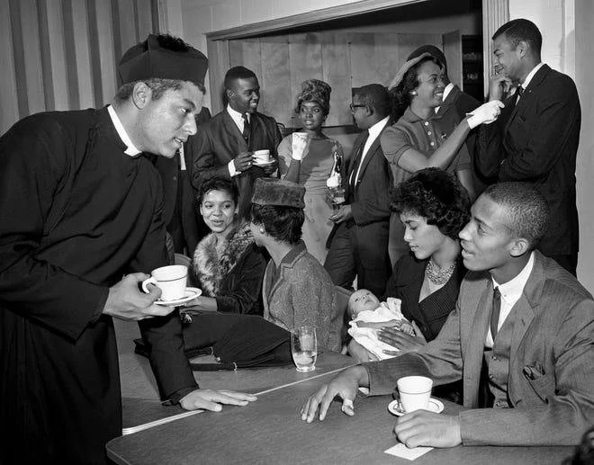 Members of St. Anselm’s Chapel gathering for fellowship after morning worship on October 29, 1961. Rev. James E. P. Woodruff, chaplain of St. Anselm’s, is on the far left.