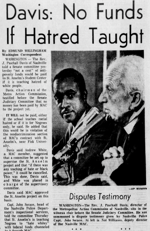 Prior to its affiliation with St. Anselm’s, the liberation school met at a community center on Jefferson Street operated by the Metropolitan Action Committee (MAC), a mayoral commission that was tasked with the local administration and distribution of federal anti-poverty funds. Mayor Beverly Briley appointed J. Paschall Davis, an attorney and member of the Christ Church vestry from 1951 through 1957 who was ordained to the priesthood in 1961, as chairman of MAC shortly after its creation in 1965. From the beginning, MAC was plagued with mismanagement, inefficiencies, and paternalistic attitudes toward both its employees and the recipients of its aid. When asked about discrimination alleged by MAC’s Black employees, for example, Davis all but confirmed the accusations, claiming “the child can’t give directions to the parents.” The liberation school met at MAC’s Jefferson Street location from February until May 1967, when the Committee shuttered all its community centers. Reporters for the Tennessean noted possible concerns about students in the liberation school being taught about Black Power, but MAC officials claimed the closures were simply part of an internal restructuring. Davis, for his part, claimed to have no knowledge the liberation school even existed.