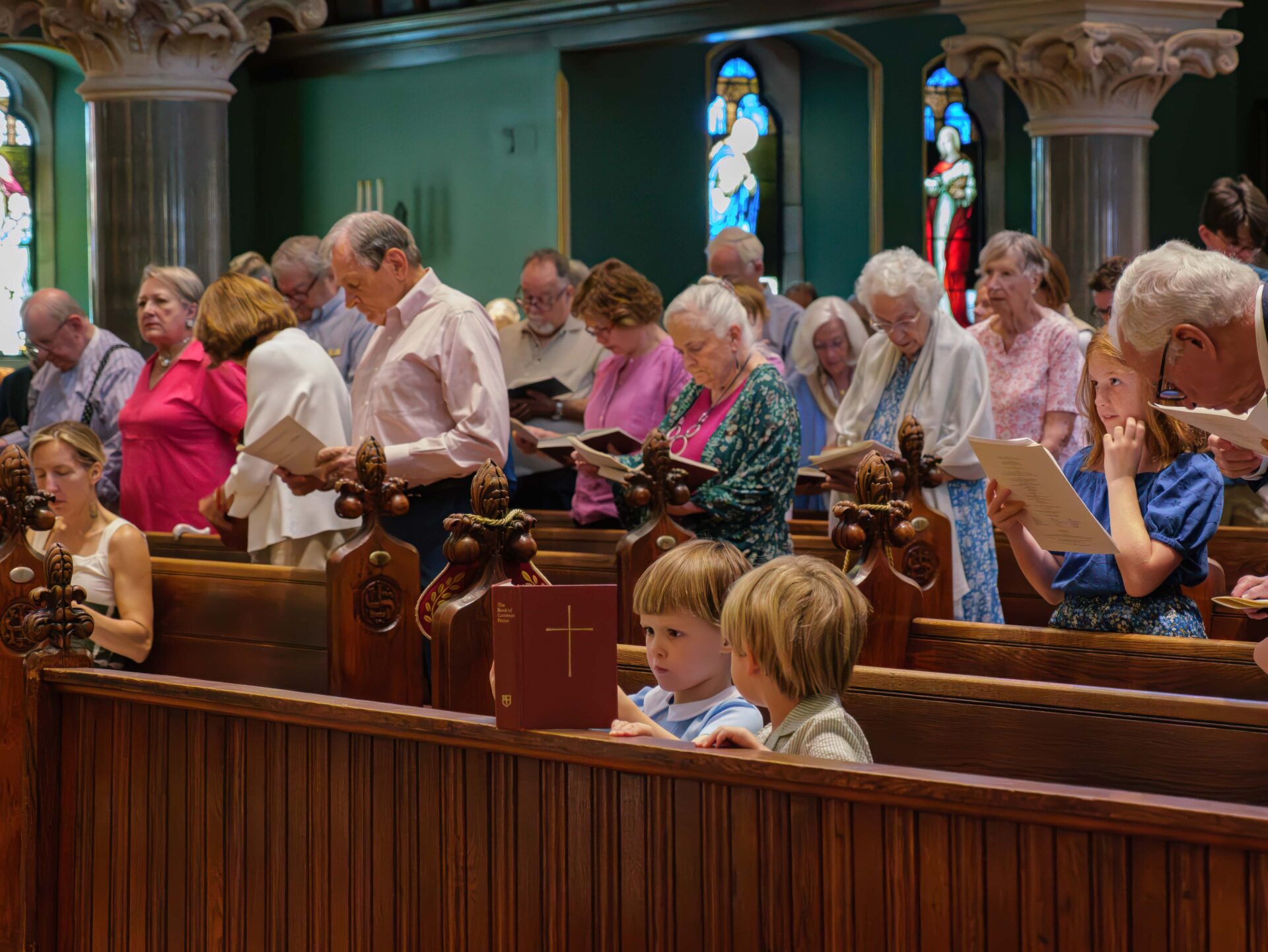 Children’s bulletins, coloring sheets, crayons, and activities are available in the hallway to the right of the altar and the kids’ nook at the middle of the left side of the nave (the sanctuary). We encourage families to sit up front so their children can see the activity in the chancel (the altar area).